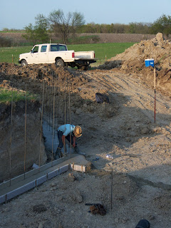 Well...day two went smoothly until sunset. What is it about dark that starts all of the problems. I am doing kindergarten screening this week, so I had to work until 6:30 possible 7:30. I got up and went to Curves at 5:30 and then work, etc, etc. I decided to take off at 11:30, so I could get some pictures of the forms and footings going in and get some housework done. The forms were going great and after work Vance and the kids got to see them pour the footings. I got there at about 6:45 and I was looking around and taking pictures and it dawned on me that there is no t-wall. It's a brace wall. Vance had forgotten about it and so now a backhoe has to come in in the morning to dig it out. Then Bree mentions treated lumber for the basement window, which we also did not have. Bummer...on the phone again making arrangements to have that delivered. So...tomorrow the forms for the walls are suppose to go up and we're hoping to pour the walls. A chance of thunderstorms tomorrow...please no:) Colby also has ball practice, I have screening and Curves, and Emma is just trying to stay out of trouble. Good luck!